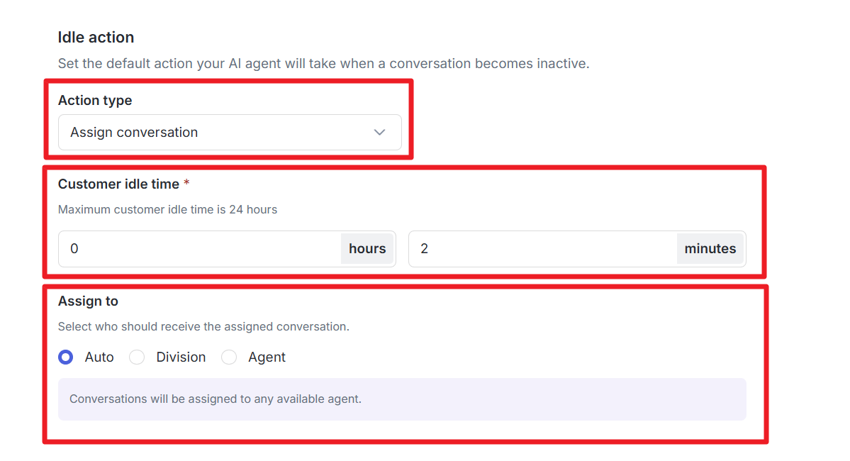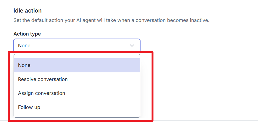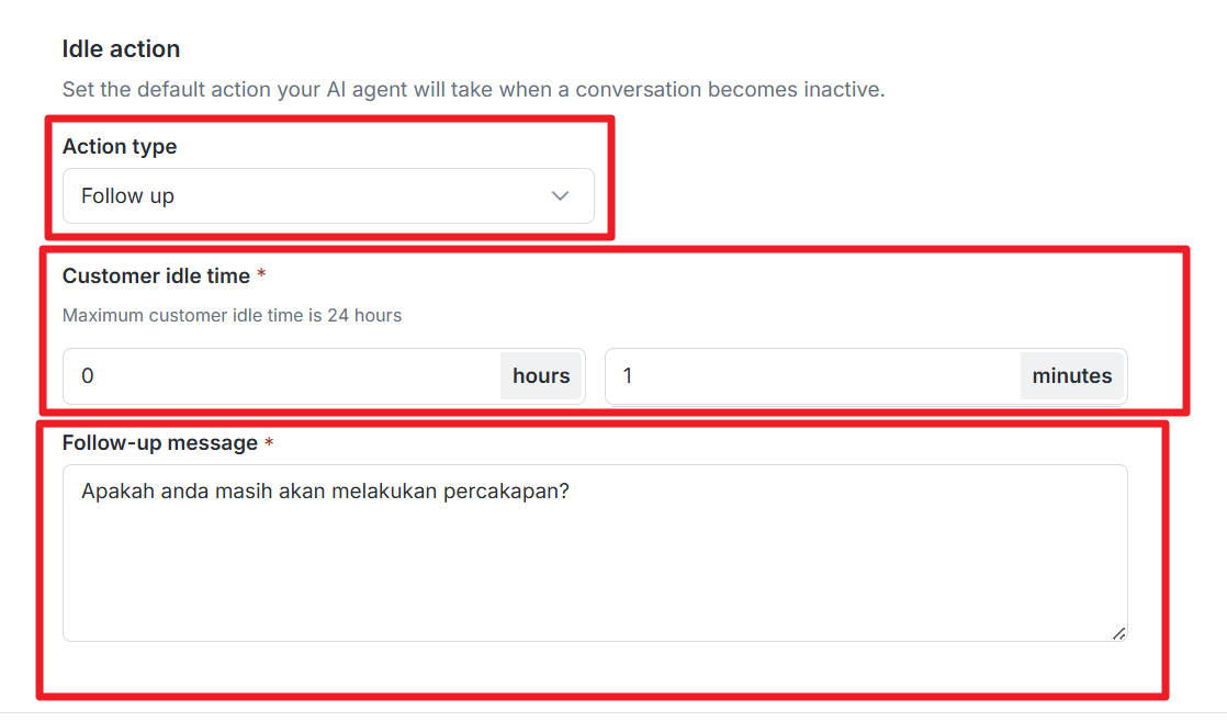 Selanjutnya, tentukan Idle Action, yaitu tindakan yang dilakukan AI Agent ketika pelanggan tidak merespons dalam jangka waktu tertentu, seperti menyelesaikan percakapan (Resolved conversation), meneruskan ke agent (Assign conversation), atau melakukan tindak lanjut (Follow up).