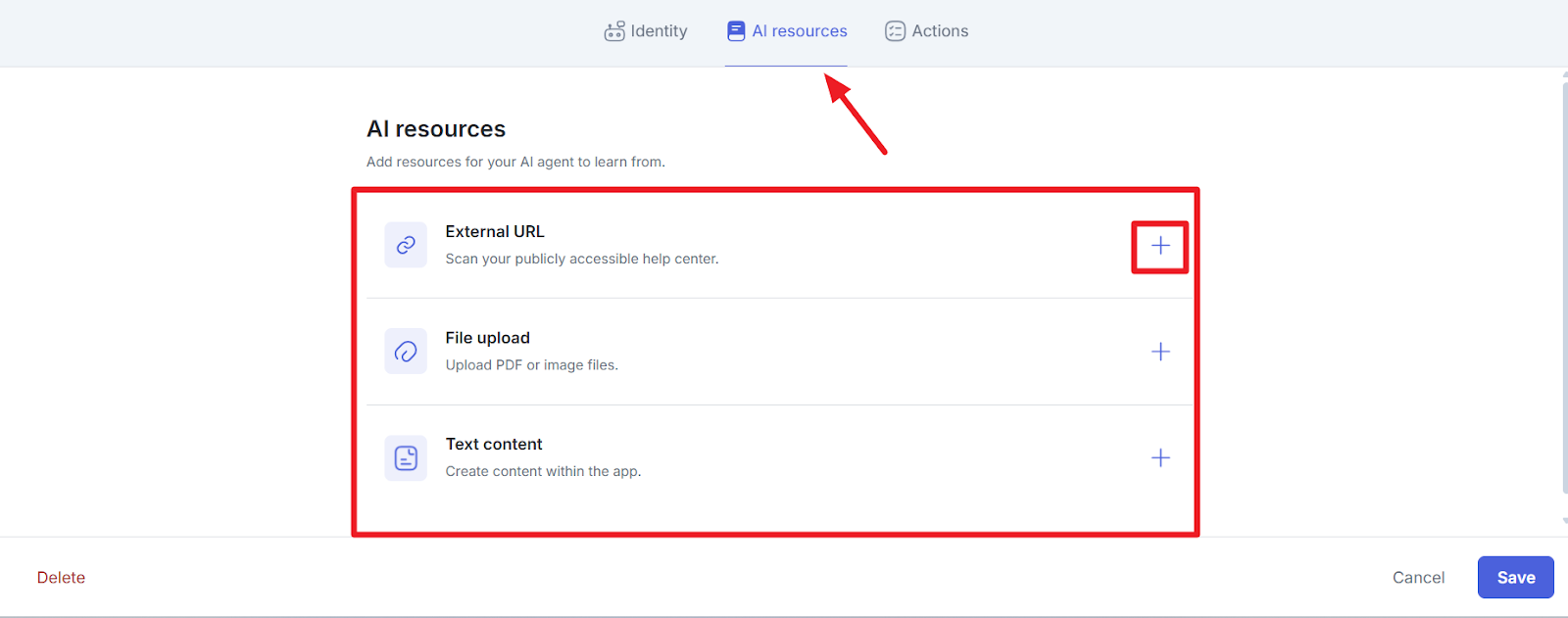 Selanjutnya klik tab “AI resources” untuk mengatur sumber pengetahuan yang dapat AI pelajari. Dalam hal ini, Anda dapat memilih External URL, File upload, ataupun Text content sebagai sumber pengetahuan dengan klik ‘ikon tambah’ pada salah satu AI resources.