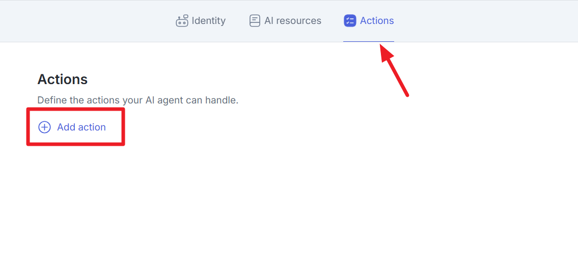 - Tampilan apabila Anda memilih Text content sebagai sumber pengetahuan AI. Selanjutnya klik tab “Actions” untuk menentukan aksi apa saja yang bisa dilakukan oleh AI Agent (tidak hanya menjawab chat). Klik “Add actions” untuk melanjutkan.