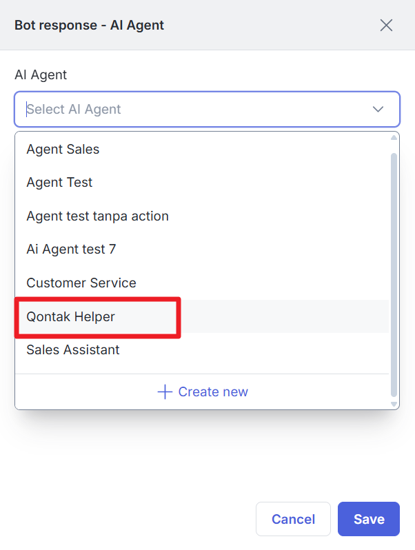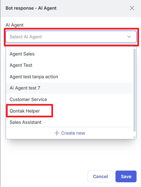 2. Lalu klik pada dropdown Select AI Agent berikut. Kemudian klik “+Create new”. - Lalu Anda akan diarahkan ke halaman pembuatan AI agent berikut. Isikan kolom nama AI agent dan deskripsi AI Agent. Kemudian klik “Continue”.