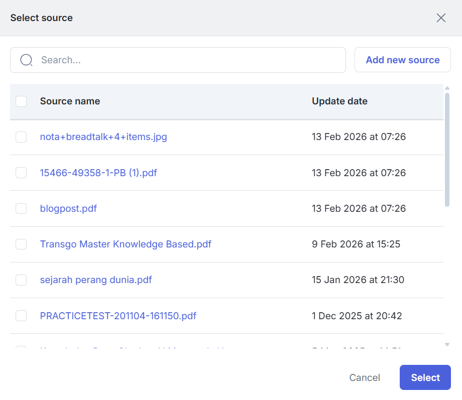 - Tampilan apabila Anda memilih File upload sebagai sumber pengetahuan AI.