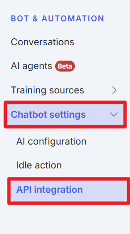 Kemudian pilih tab Chatbot settings dan pilih “API integration”.
