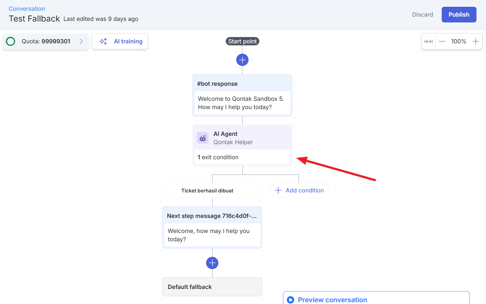 Ikuti langkah-langkah berikut untuk mengintegrasikan AI Agent ke dalam alur percakapan yang sudah ada: